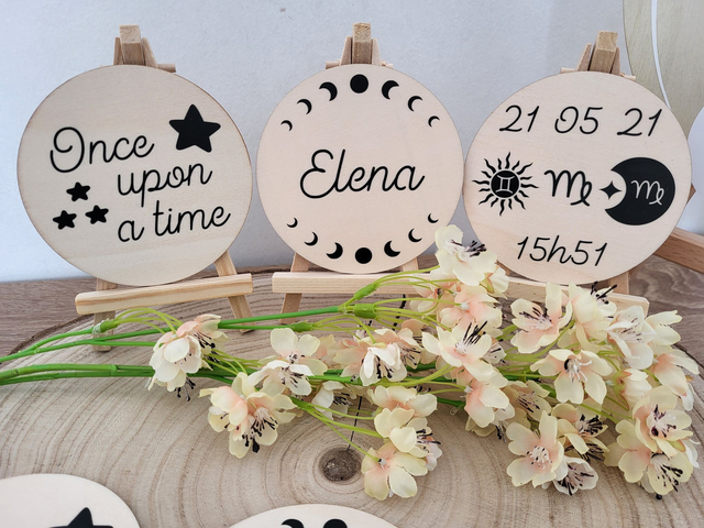 Cartes en bois triptyque personnalisées avec le prénom, la date et heure de naissance et les signes astrologiques solaire, ascendant et lunaire.