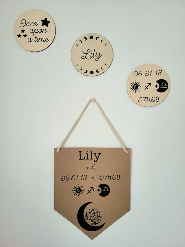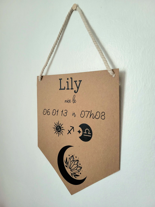 Fanion en papier kraft personnalisé avec le prénom, la date et heure de naissance et les signes astrologiques solaire, ascendant et lunaire.