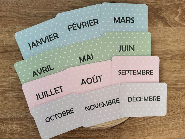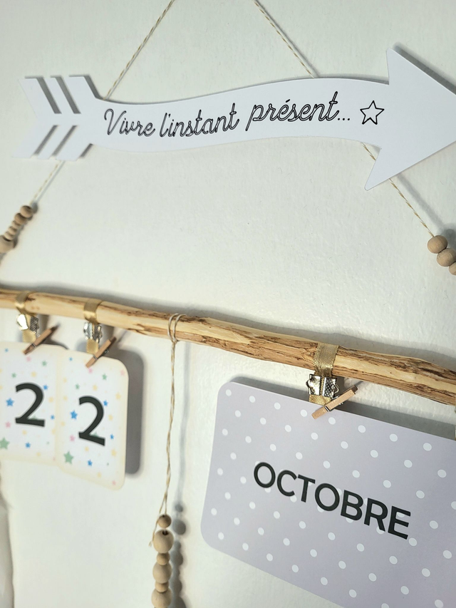 La suspension est livrée assemblée et avec 3 mini pinces à linge en bois, 12 chiffres, et 12 mois imprimés sur papier 300 g avec bouts arrondis.