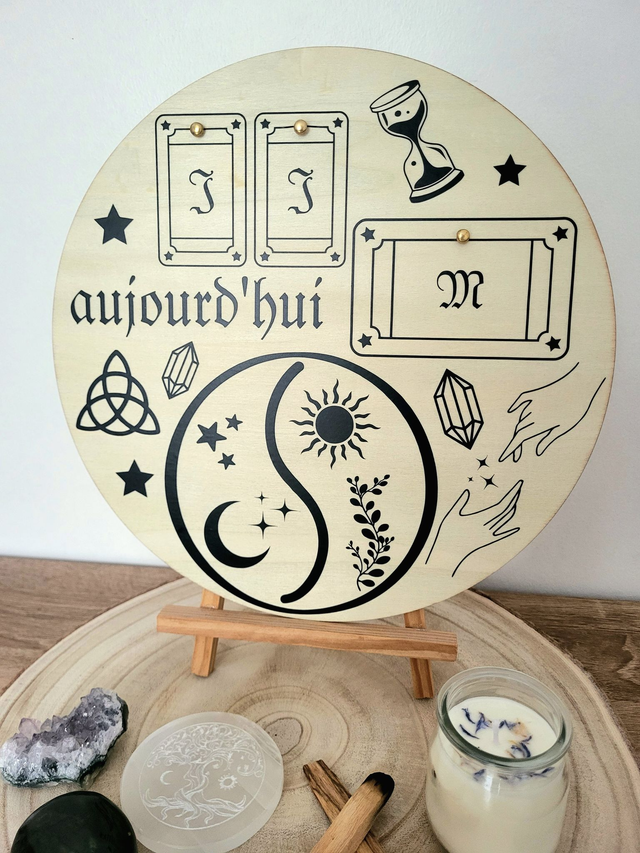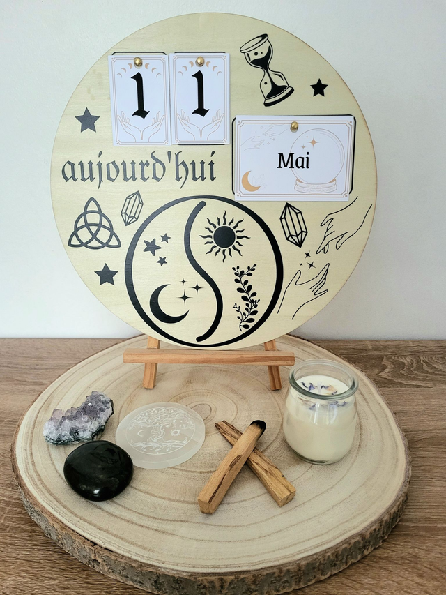Calendrier perpétuel au format rond en bois sous le thème du Tarot.