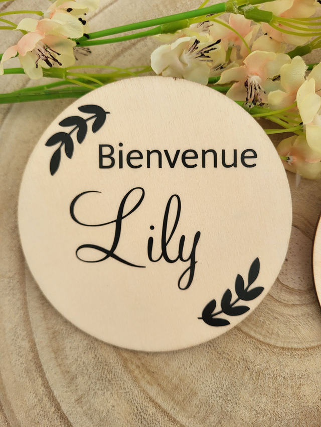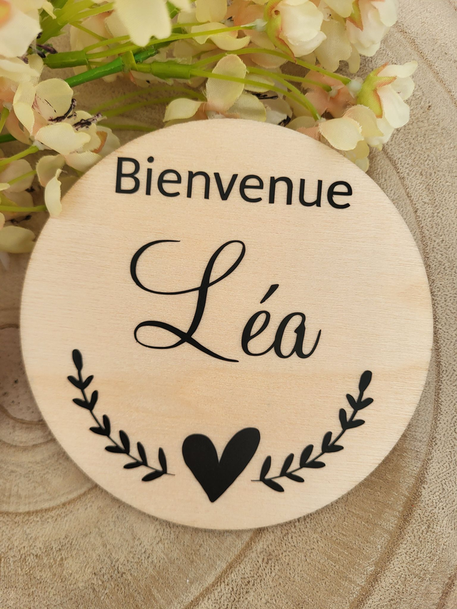 Carte en bois bienvenue personnalisée avec le prénom de l'enfant.